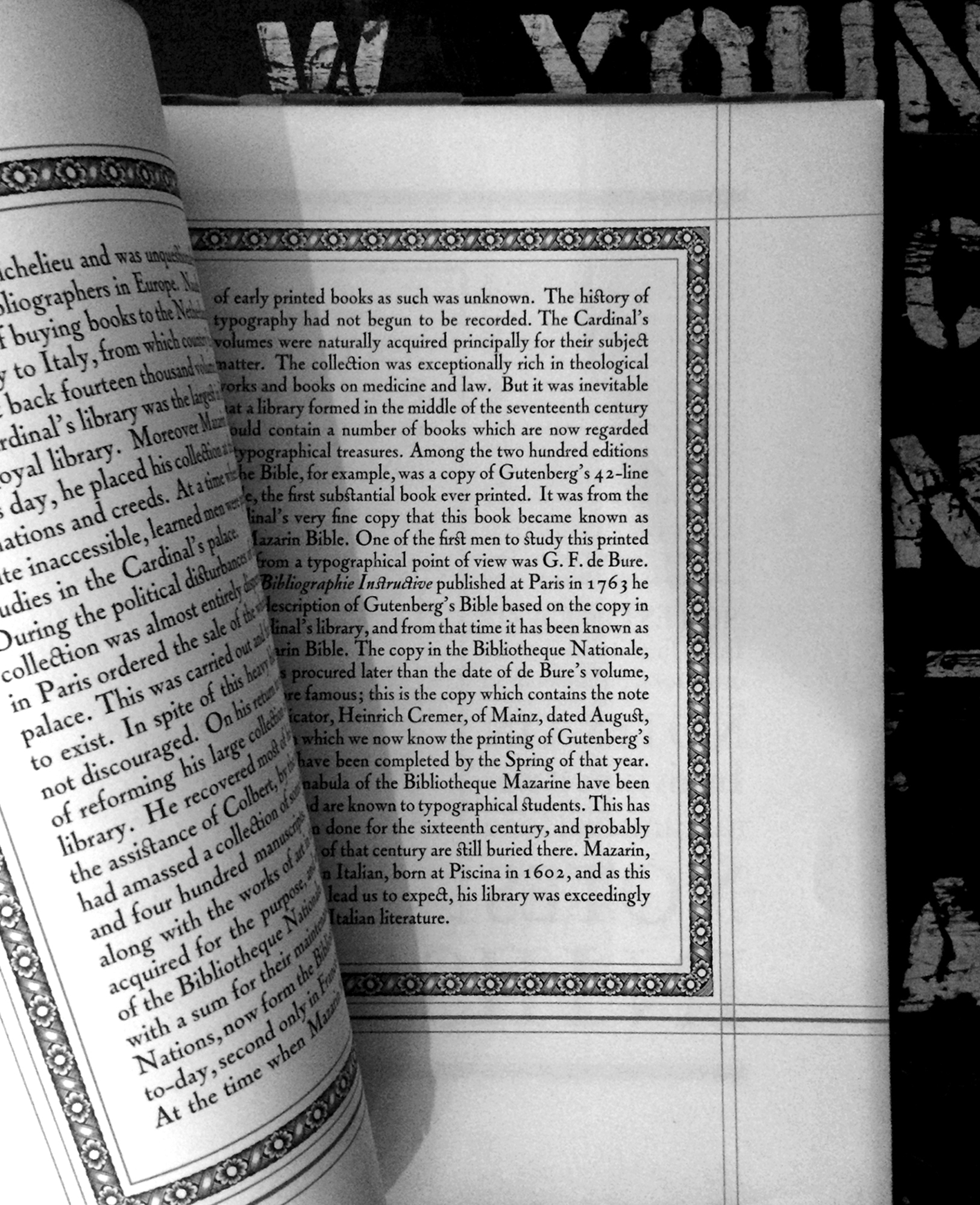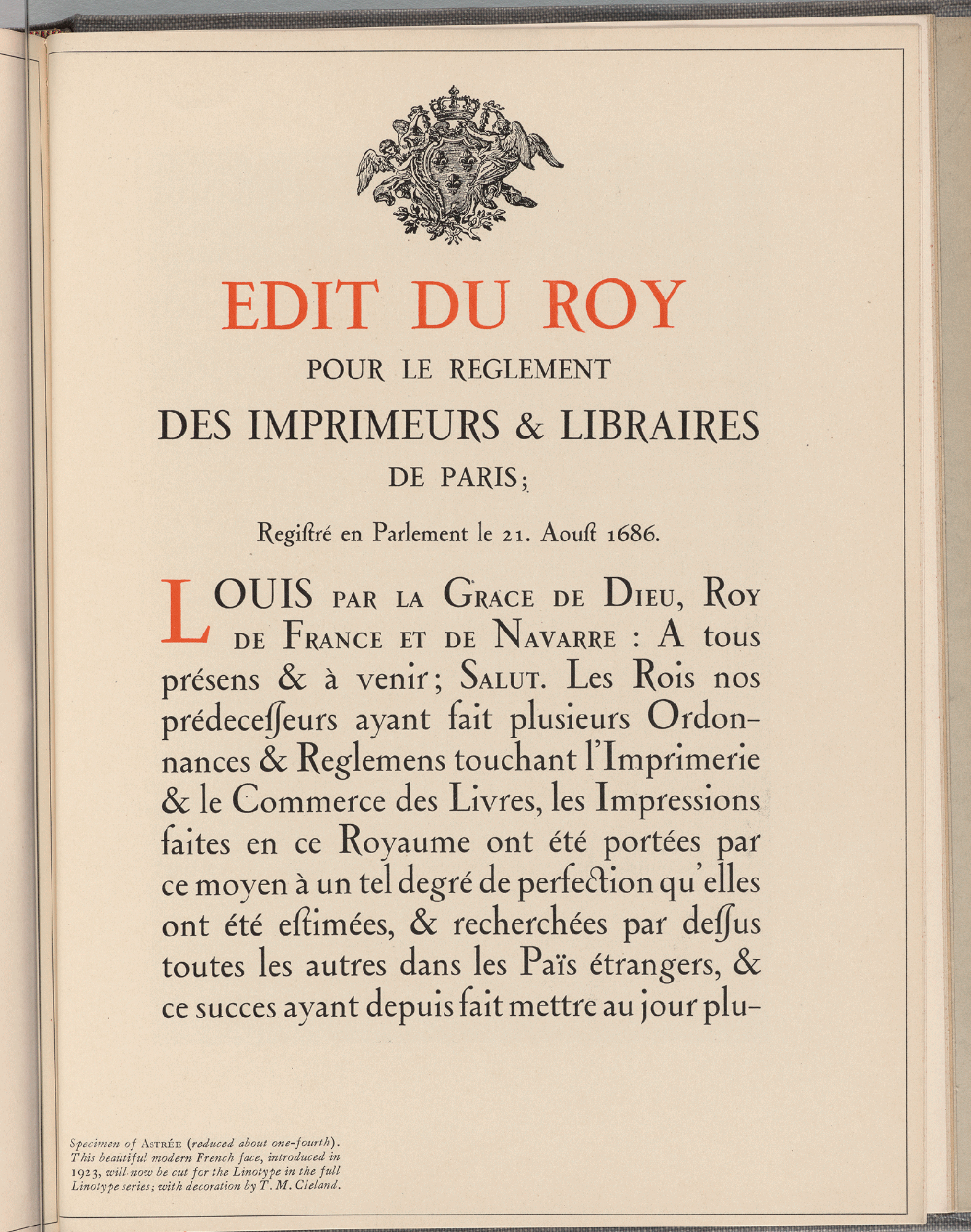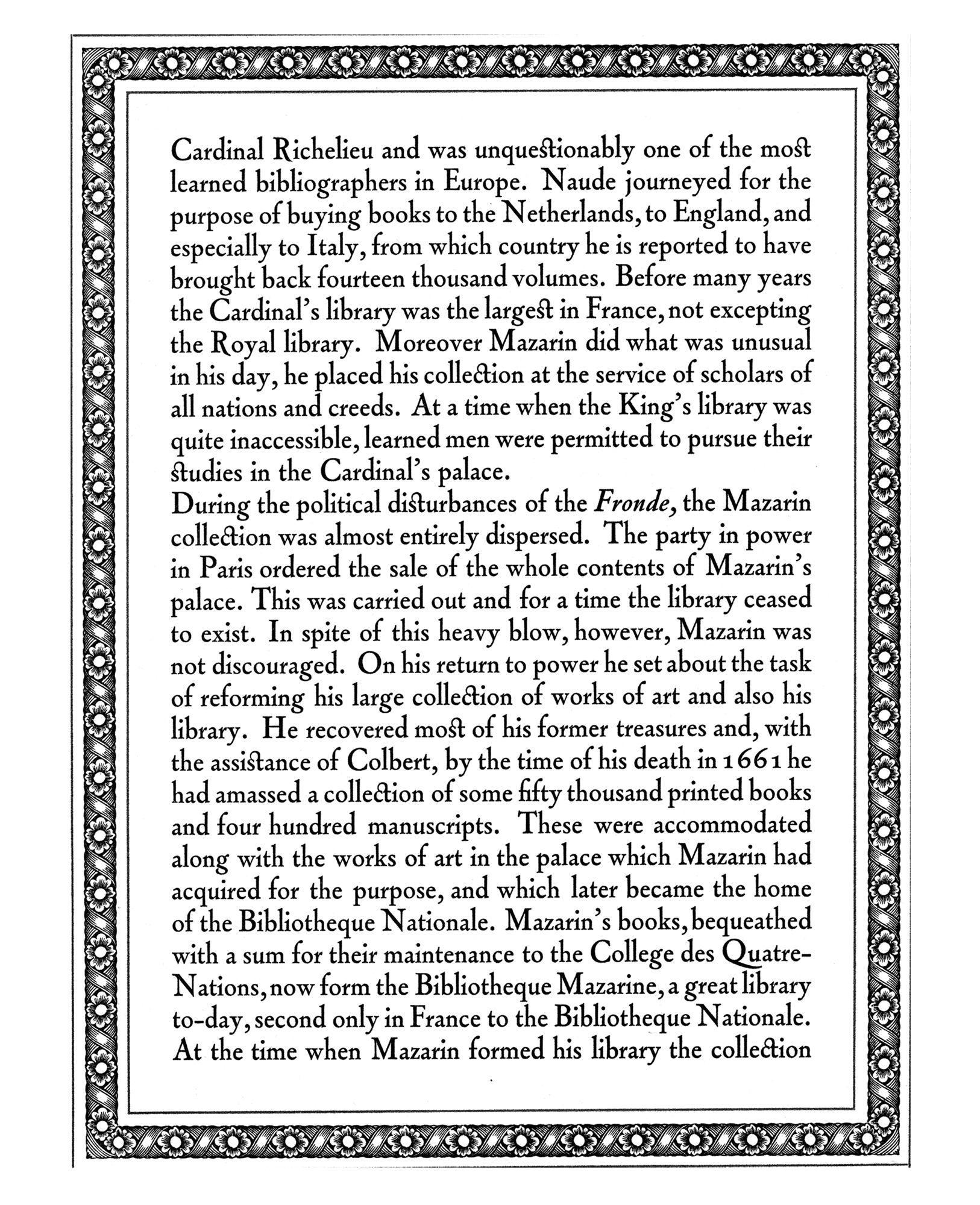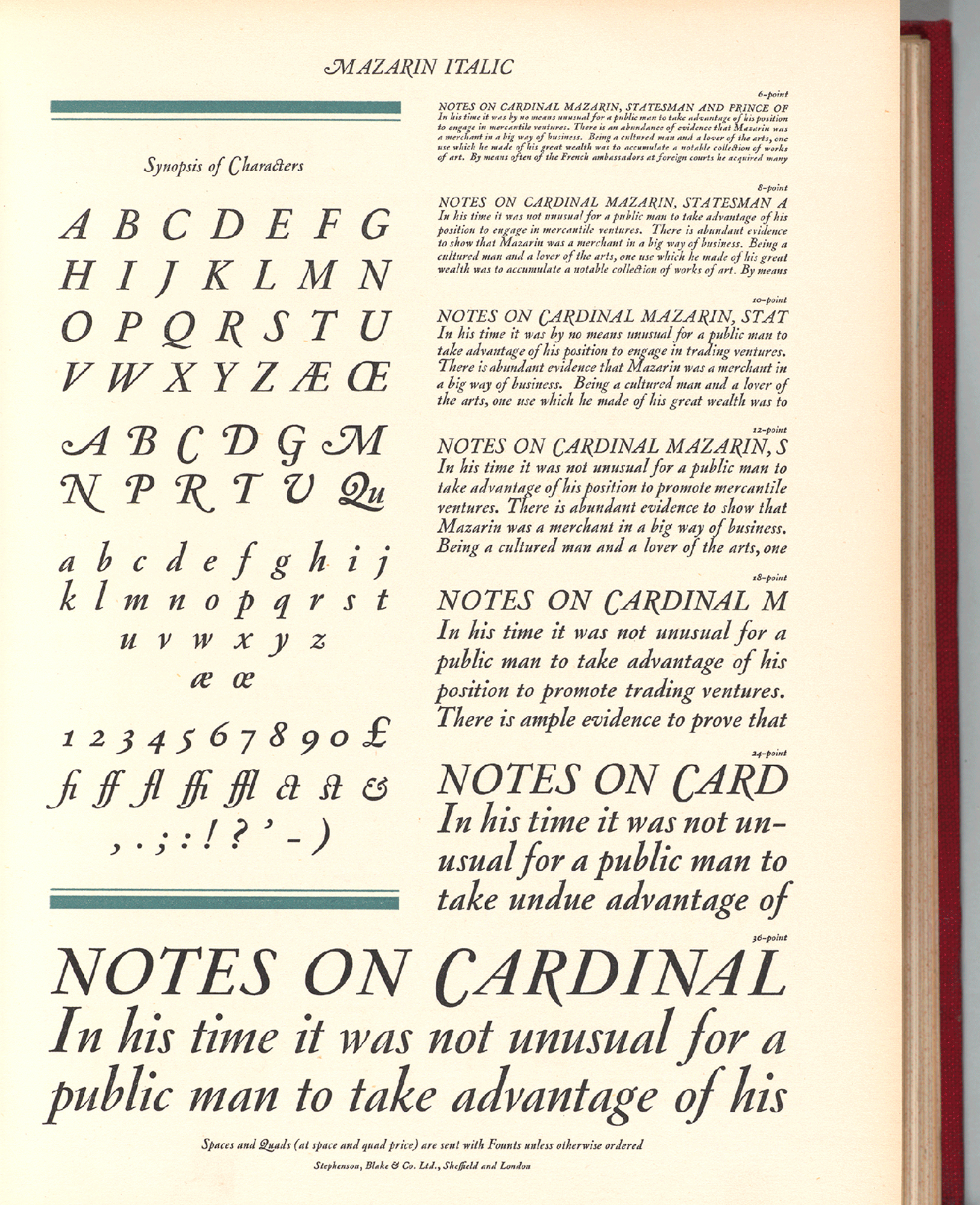 Soon after the merger of G. Peignot & Fils and Girard & Cie, the newly named Deberny & Peignot exported the “Le Cochin collection” of types and Naudin to England and the United States with immediate success. This must have caught the attention of type executives in both countries because plans were soon made to make L’Astrée available as well. By sometime in 1924 Stephenson, Blake & Co., Ltd. had begun work on a licensed copy. [8] Their version, renamed Mazarin after Cardinal Mazarin (1602–1661), the chief minister to Louis XIII and Louis XIV, was ready by March 1926, though the first specimen was not published until two months later. [9]