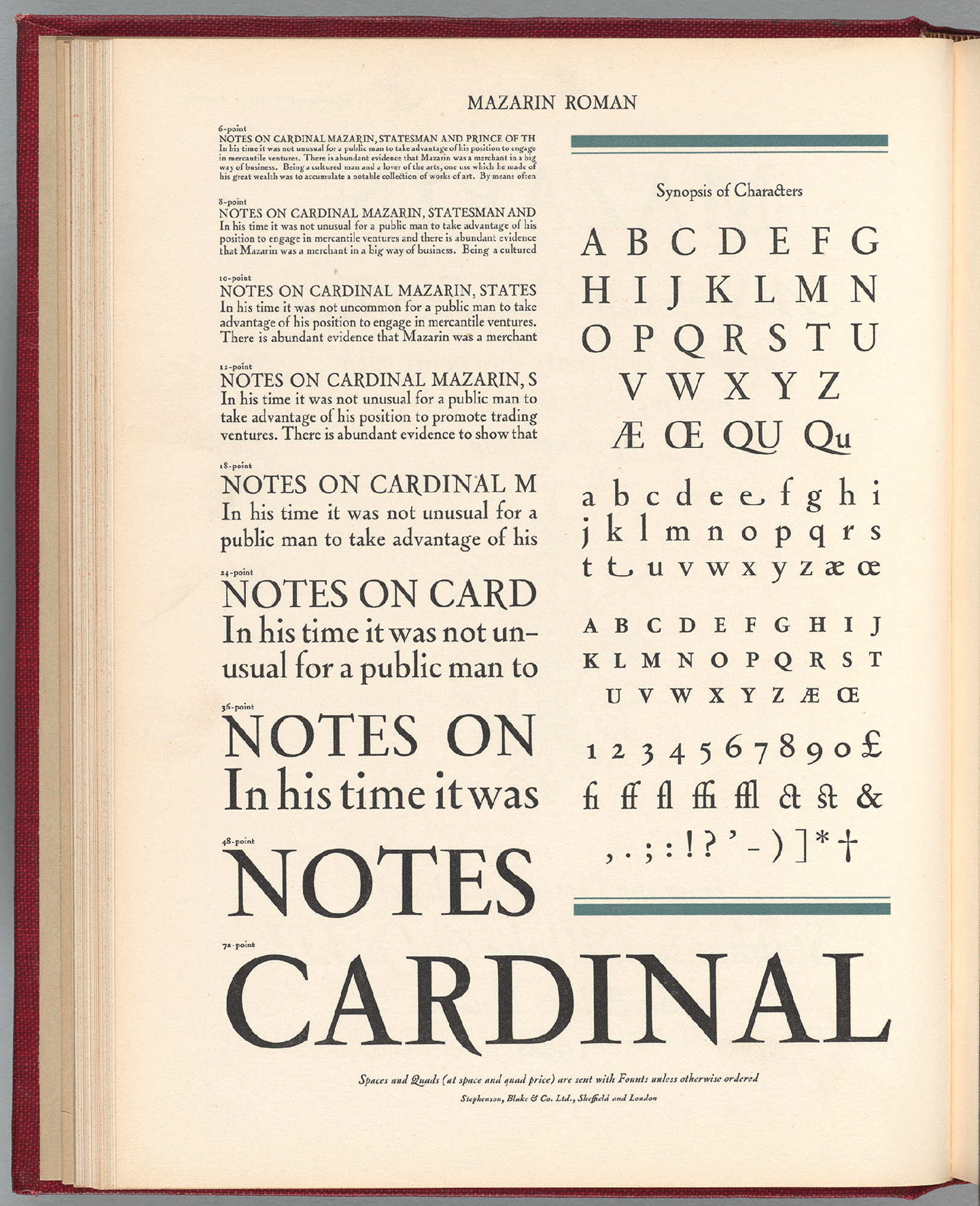 8. Mazarin was used on the spine of the 1924 Stephenson, Blake & Co., Ltd. catalogue, but did not appear inside. The catalogue was issued in May 1924.