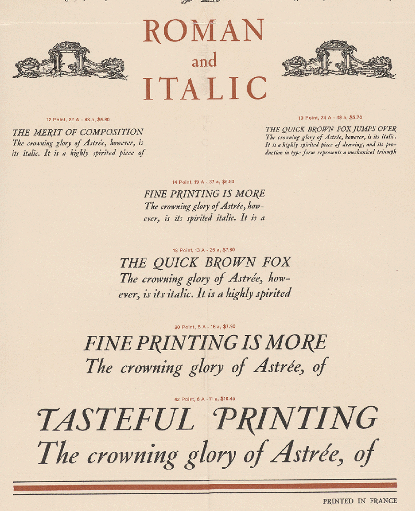 By the time the merger of the two foundries was finalized on July 1, 1923, L’Astrée had been completed and released by Girard & Cie. An advance showing was provided to Pierre Gusman in the fall of 1922. Writing in Byblis, he described L’Astrée as inspired by the types of Guillaume Le Bé, though there is no documentary evidence to support his assertion. [5] The first specimen book of L’Astrée, titled L’Astrée Caractère Comportant le Romain et Son Italique Gravé et Fondu par Girard & Cie, is precisely dated May 7, 1923, less than two months before the merger. Its colophon indicates that the type was engraved—probably pantographically—by Paul Bourreau and cast by Pochet (no first name provided). [6] Astrée (called L’Astrée by the French) was named after the 17th century pastoral novel L’ Astrée (1607-1627) by Honoré d’ Urfé.