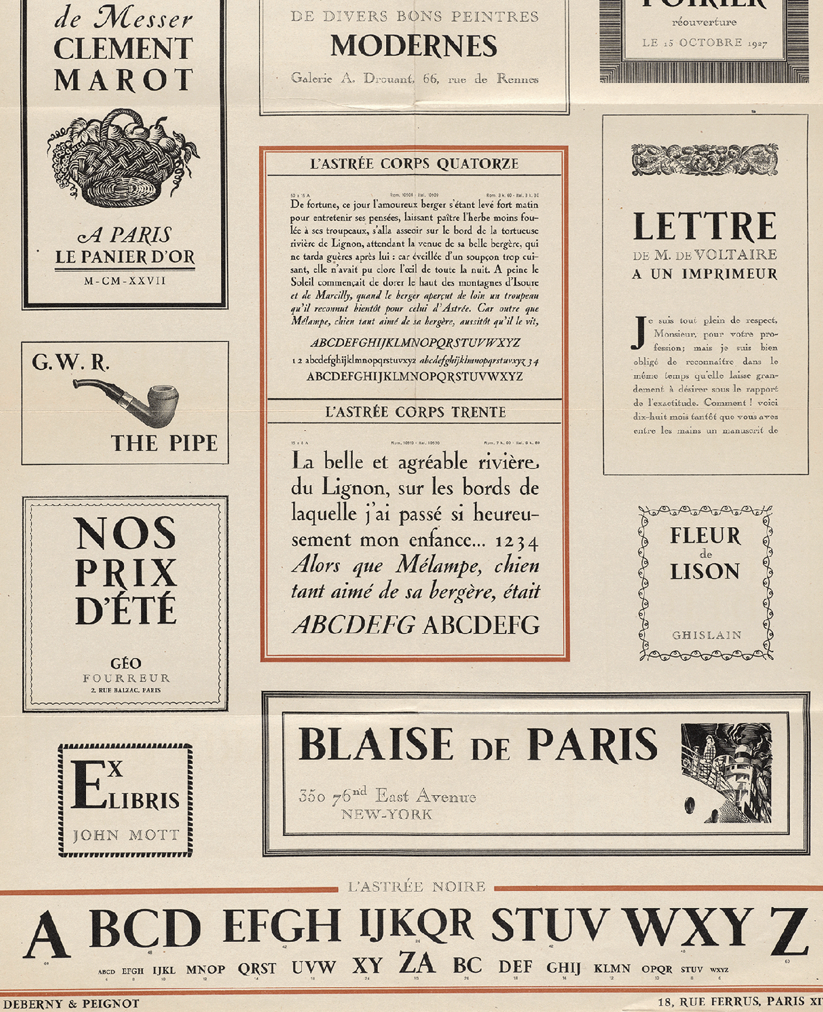 3. The date “vers 1913” is cited in a quotation from Charles Peignot provided in an email from Jean Francois Porchez, 14 May 2013. Also see Spécimen Général des Fonderies Deberny et Peignot, Tome I (Paris: Deberny & Peignot, 1926): ”Dernier directeur de Deberny, Robert Girard avait dessiné l’Astrée, peu avant la guerre…”