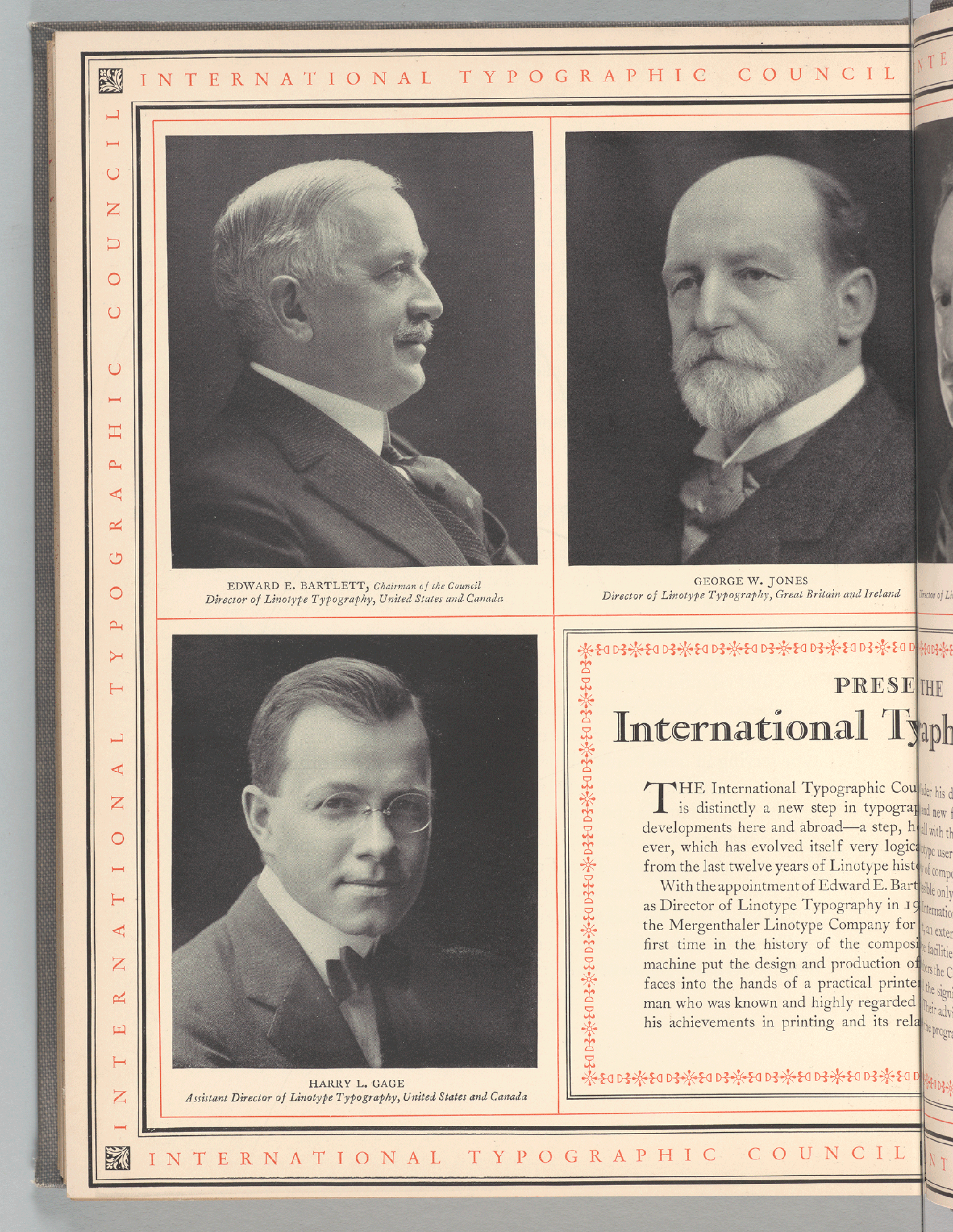 This was because E.E. Bartlett, Director of Linotype Typography at Mergenthaler, had spent 1925 organizing an International Typographic Council. The Council—consisting of Bartlett and Harry L. Gage from Mergenthaler Linotype; George W. Jones of Linotype & Machinery, Ltd. in England; David Stempel of D. Stempel AG and Mergenthaler Setzmaschinen-Fabrik in Germany; Raffaello Bertieri, editor of Il Risorgimento Grafico in Italy; and Charles Draeger of Draeger Frères, a leading French printer—was officially announced in January 1926. At that time, Mergenthaler also announced that as a result of this internatinal cooperation they would be making a group of new types: Cloister Old Style [sic], Baskerville, Narciss, Garamond (from Stempel), Moreau-le-Jeune, and L’Astrée. [15] In response to this announcement The American Printer remarked that L’Astrée “has obtained a wide use in Europe and will doubtless find great popularity in this country.” [16] Mergenthaler touted the type’s French heritage, even as it anglicized the name: “Astrée is the final and happy result of a great modern revaluation of its [France’s] own typographical history which has taught its designers what was sound and therefore to be kept alive, and what was unsound and therefore to be eliminated….The French genius for elegance has in this type achieved the feat of producing an elegance that is the same in every and any national environment….” [17]