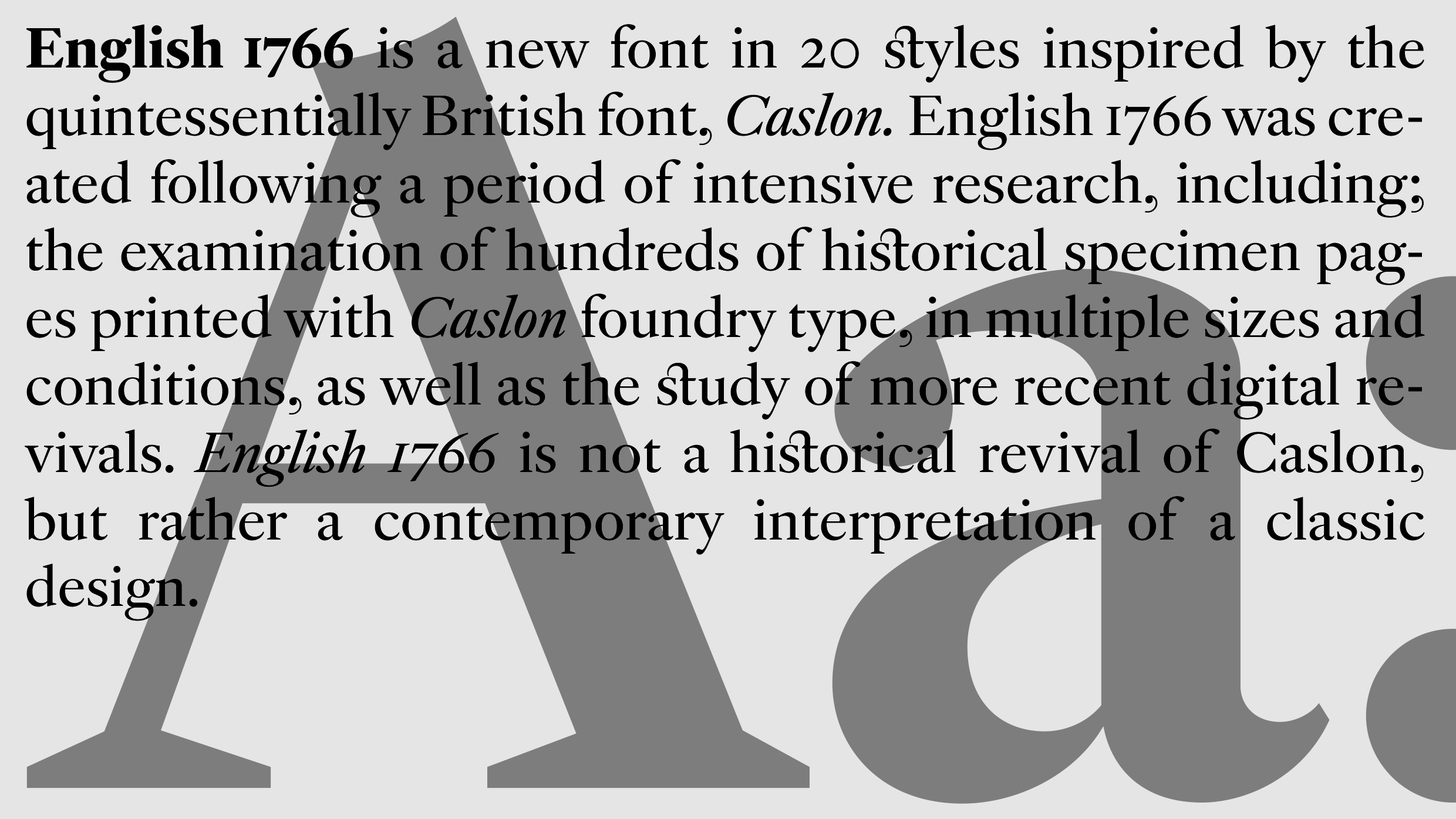 English 1766 is a new font with 20 styles inspired by the quintessentially British font, Caslon. English 1766 was created following a period of intensive research, including the examination of historical type specimen pages printed with Caslon foundry type in multiple sizes and conditions, as well as the study of more recent digital revivals. English 1766 is not a historical revival of Caslon but rather a contemporary interpretation of a classic design.